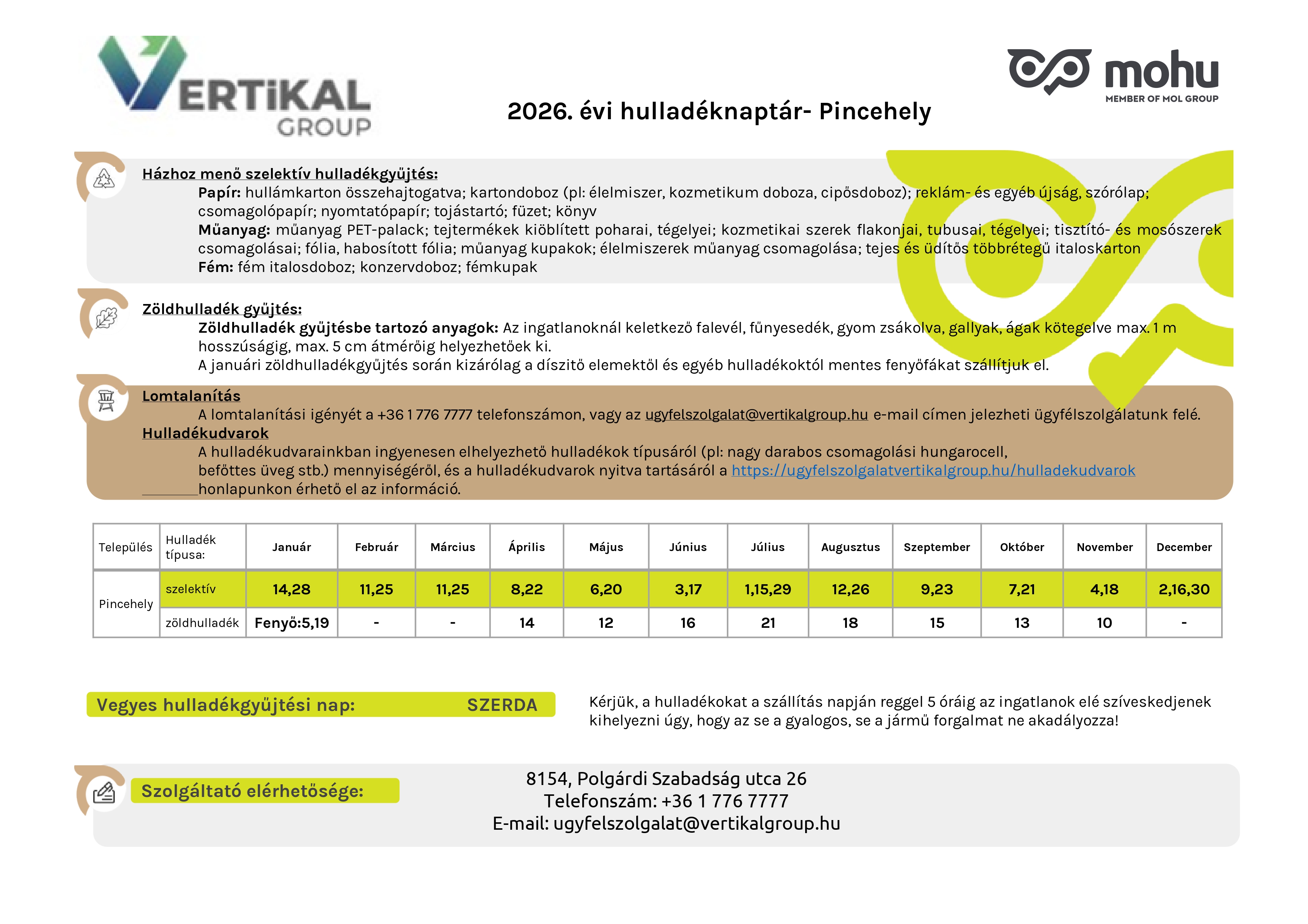 A 2026. évi hulladékszállítási naptár nyomtatható formában az alábbi linkről letölthető: https://ugyfelszolgalat-vertikalgroup.hu/images/dokumentumok/hulladeknaptar2026/DD/7084_pincehely_hulladeknaptar2026.pdf hulladékszállítási naptár 2026 Pincehely